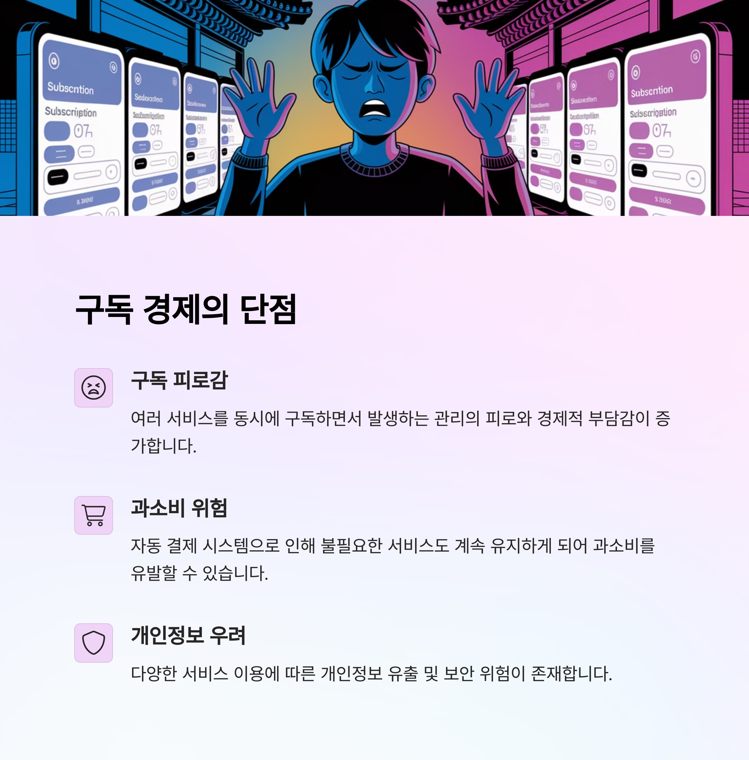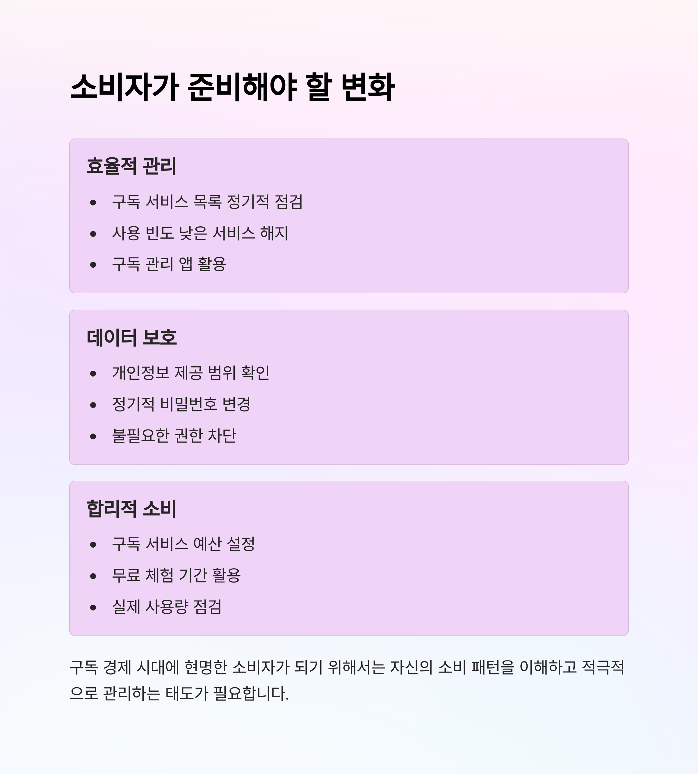 여러분은 어떤 구독 서비스를 사용하고 계신가요? 앞으로의 소비 생활에서 구독이 어떤 변화를 가져올지, 이제 우리 모두의 선택이 중요한 시점입니다. 오늘 내용이 여러분의 생활에 도움이 되었길 바랍니다.