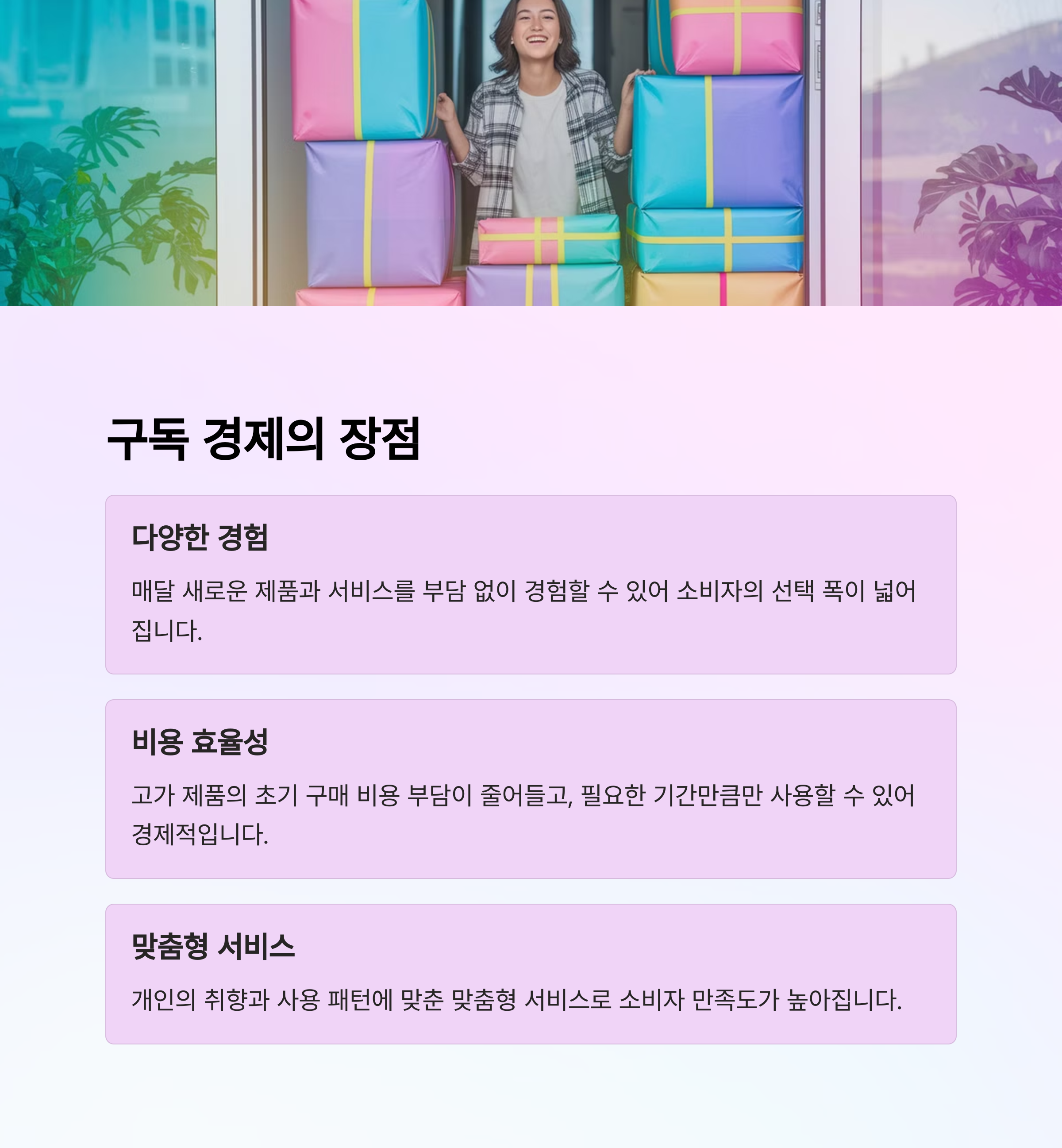 구독 경제는 소비의 패러다임을 바꾸고 있습니다. 단순 소유를 넘어서, 지속적인 경험과 편리함을 중시하는 흐름으로 바뀌고 있으며, 이는 기업에게도 안정적인 수익 구조를 제공하는 장점이 있습니다.