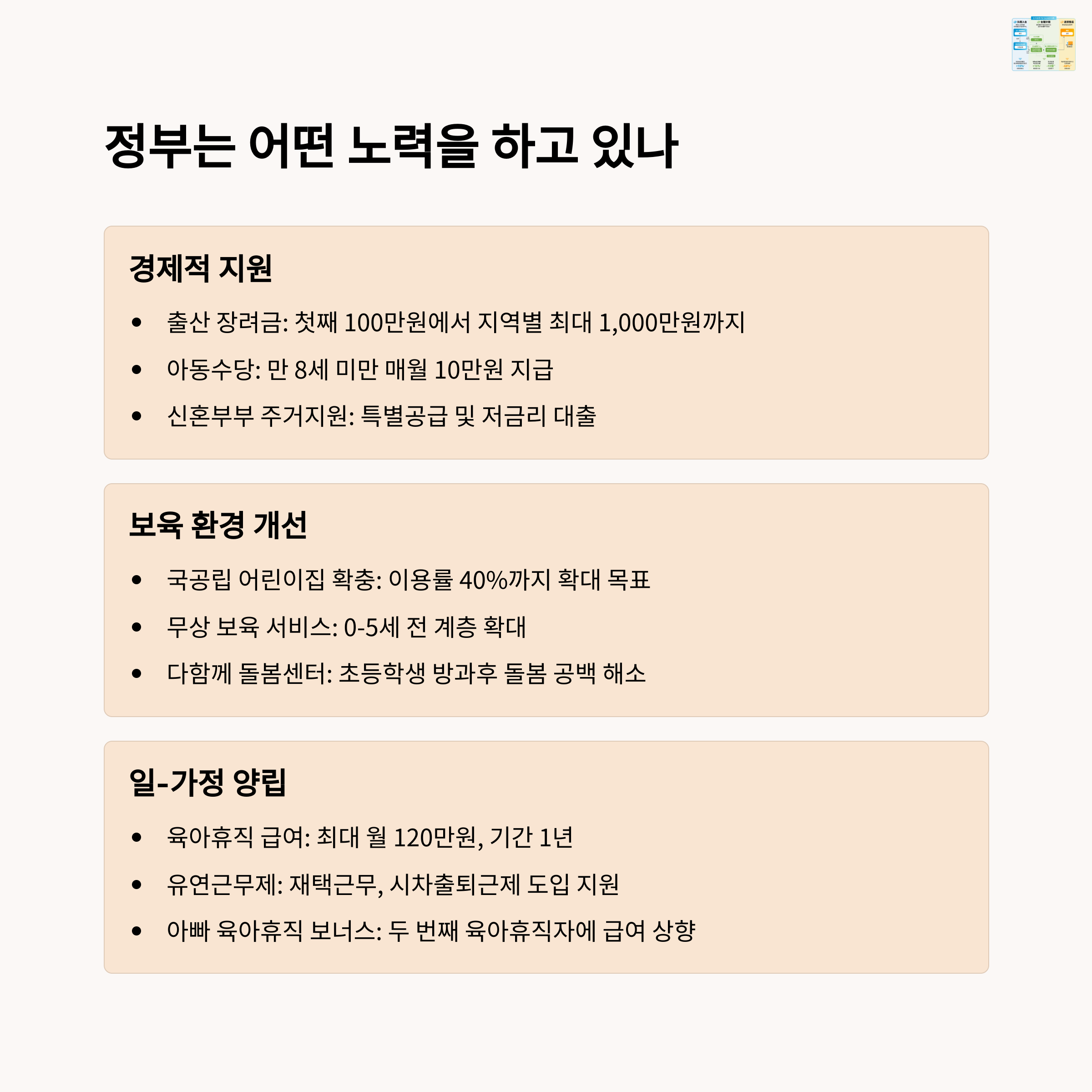 정부는 출산율 회복을 위해 여러 가지 대책을 발표했습니다. 대표적으로는 출산 장려금 지급, 육아휴직 지원 확대, 주택 지원 정책 등이 있습니다. 특히, 최근에는 저출산 문제 해결을 위해 장기적인 정책을 수립하고 있으며, 어린이집과 유치원의 비용을 낮추고, 여성의 경력 단절을 방지하기 위한 다양한 프로그램도 추진하고 있습니다. 하지만 이러한 대책들이 실제로 출산율을 높이는 데 얼마나 효과적일지는 아직 불확실합니다.