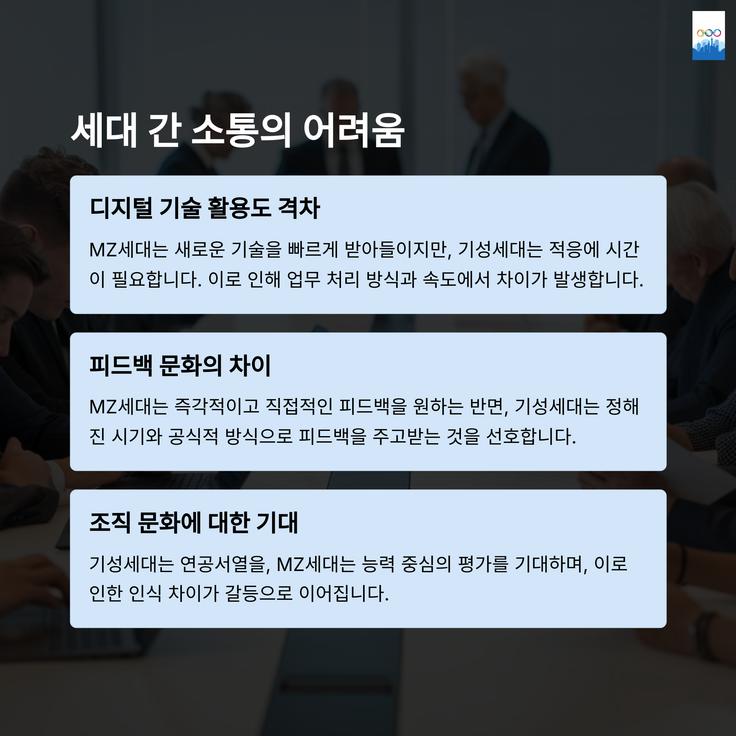 | 상호 존중 | 기성세대의 경험을 존중 | MZ세대의 혁신적 접근을 존중 |