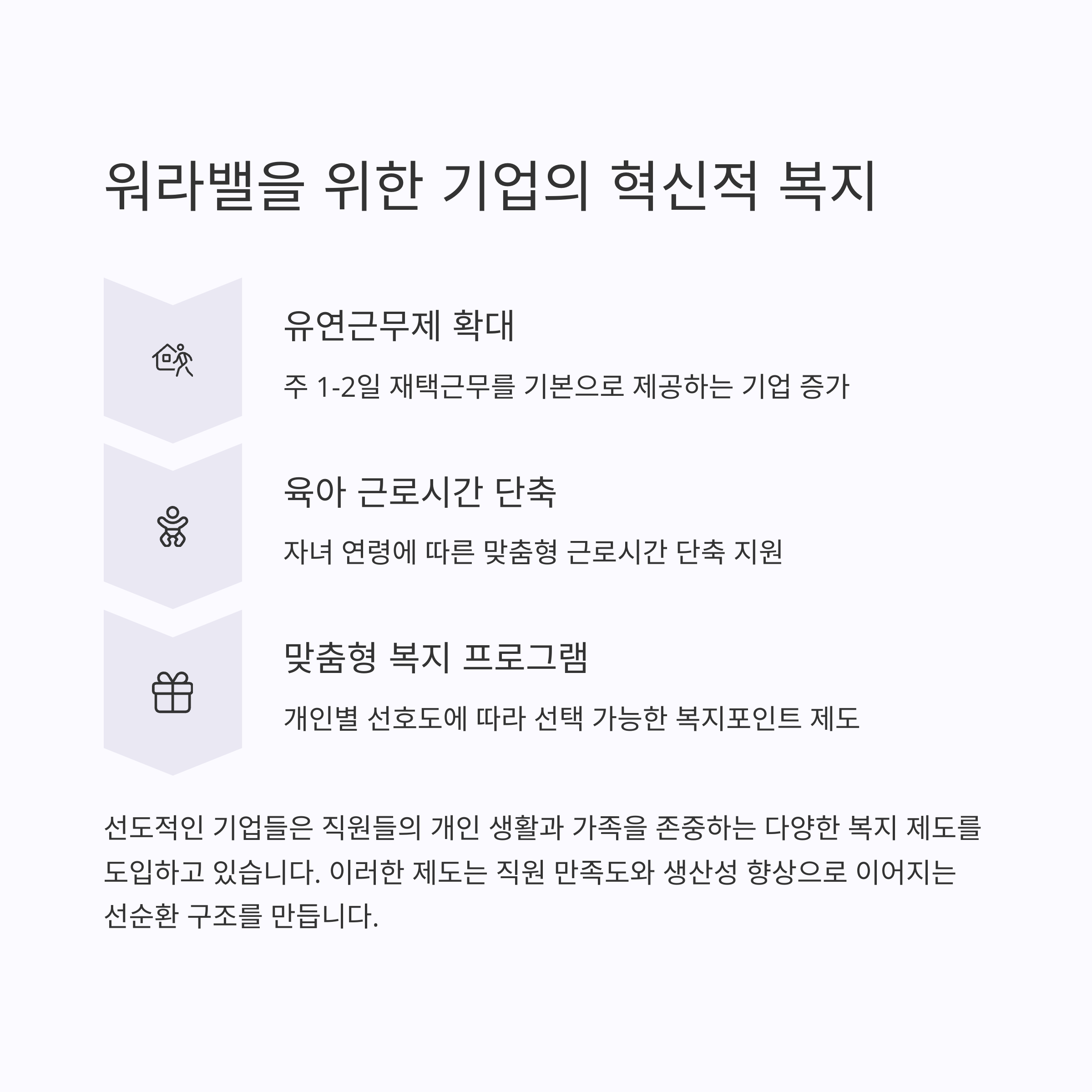 워라밸을 위한 복지는 직원의 삶의 질 향상뿐만 아니라 기업의 생산성과도 밀접한 관계가 있습니다. 적절한 복지 제도는 직장인의 만족도를 높여 기업의 경쟁력을 강화하는 데 중요한 요소입니다.
