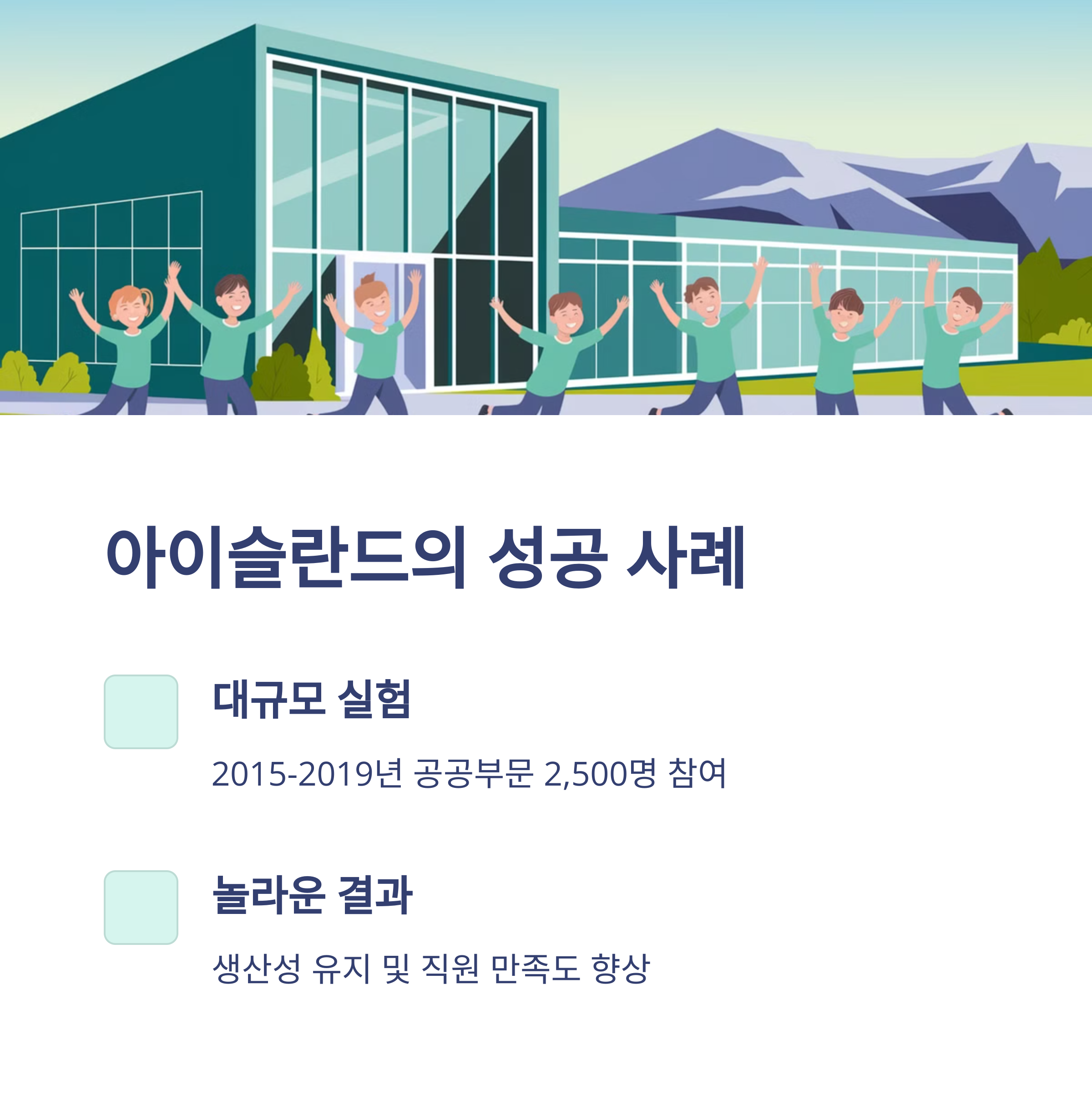 | 아이슬란드 | 2015-2019 | 생산성 증가, 직무 만족도 향상 |