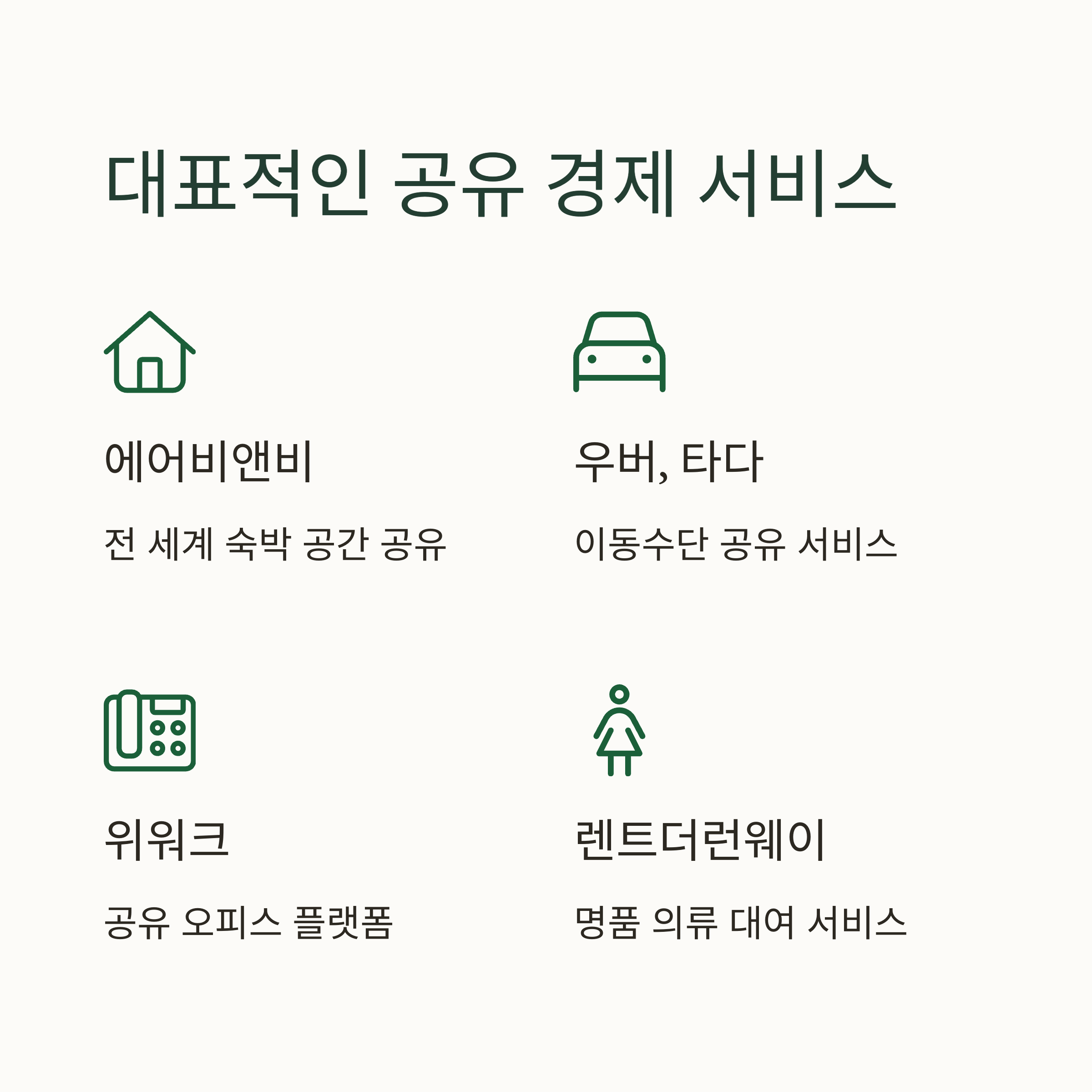 | 공유 경제 | 필요할 때만 공유하거나 대여하는 방식 | 자원의 효율적 사용과 환경 보호에 기여 |
